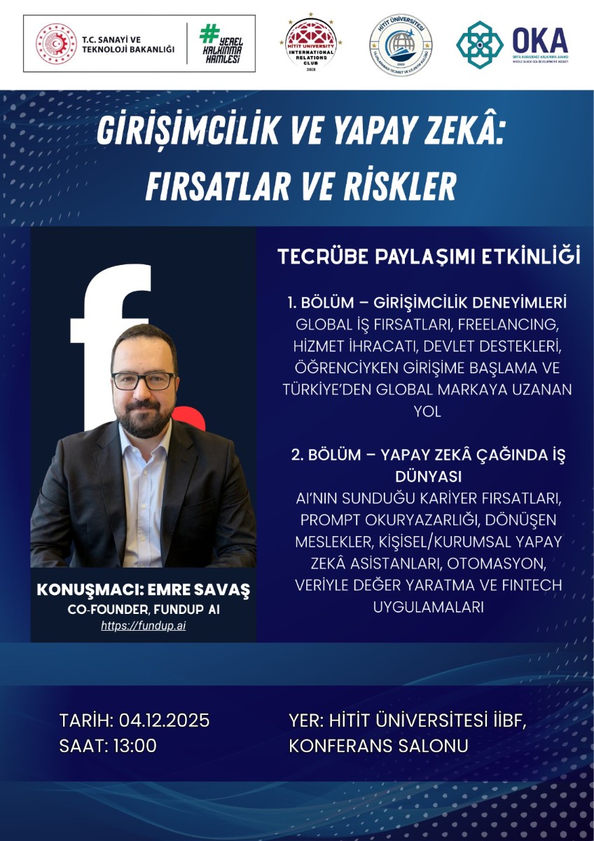 Programın ilk bölümünde Orta Karadeniz Kalkınma Ajansı (OKA) faaliyetleri hakkında bilgilendirme yapılacak; ardından FUNDUP AI Kurucu Ortağı ve Geliştirici Emre Savaş, girişimcilik yolculuğunu ve yapay zekânın sunduğu yeni iş modellerine dair deneyimlerini öğrencilerle paylaşacaktır.