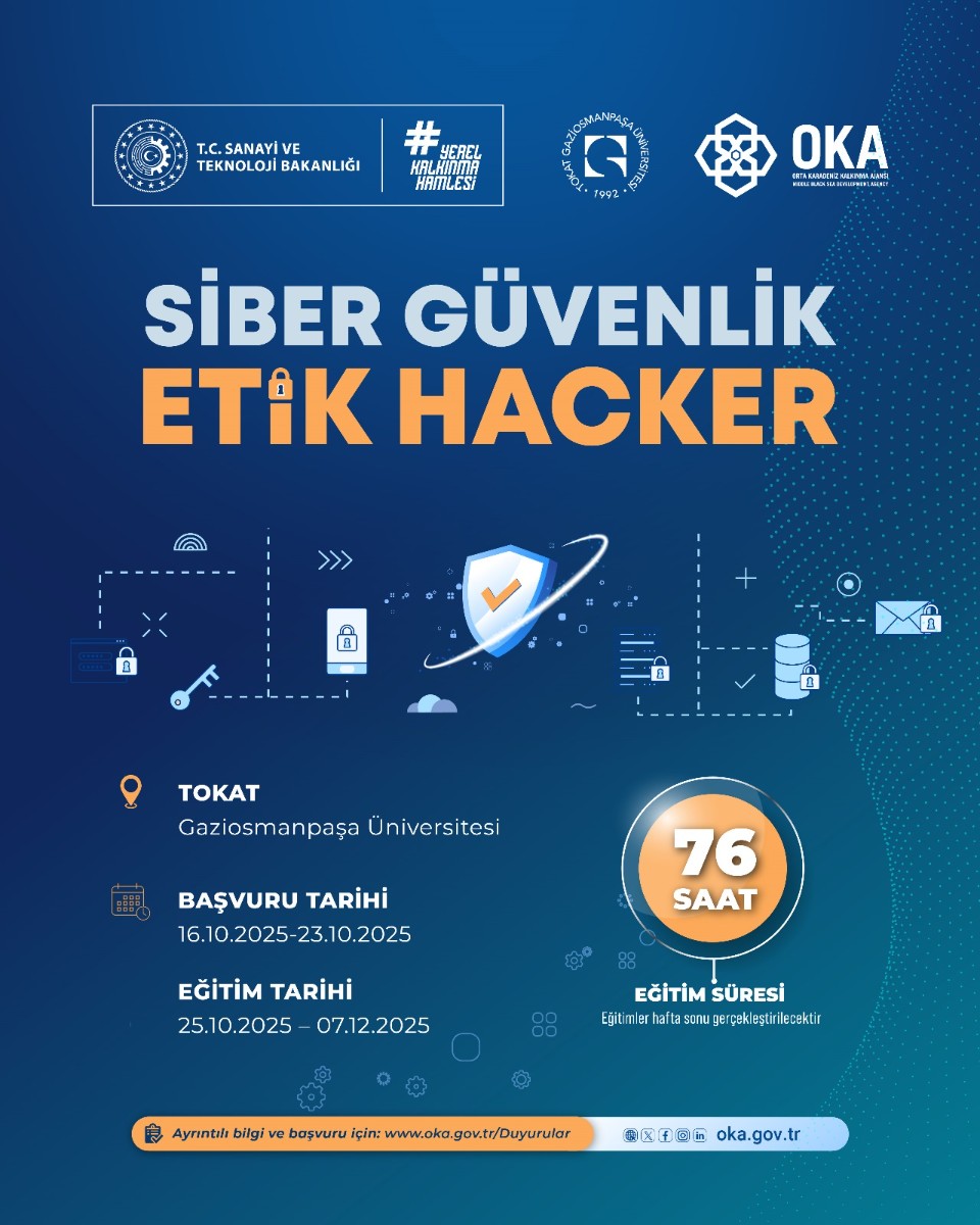 Orta Karadeniz Kalkınma Ajansı (OKA) ve Tokat Gaziosmanpaşa Üniversitesi (TOGÜ) iş birliğiyle, kadınların dijital dünyadaki yetkinliklerini artırmak amacıyla “Siber Güvenlik ve Etik Hacker Eğitimi” düzenleniyor.