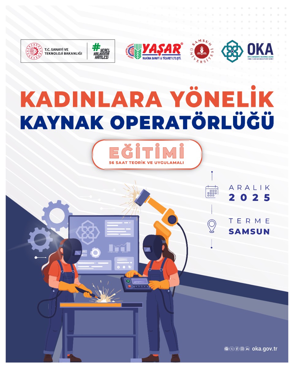 Kalkınma Ajansları "2024-2025 Yılı Kadın İstihdamı ve Kadın Girişimciliği" teması kapsamında Orta Karadeniz Kalkınma Ajansı, Samsun Üniversitesi ve Yaşar Makine Sanayi iş birliğinde düzenlenecek toplam 56 saatlik Kaynak Operatörlüğü Eğitimiylekatılımcı 10 kadının kadınların sanayi sektöründe güçlenmesini ve meslek sahibi olmasını desteklemek amaçlanmaktadır.