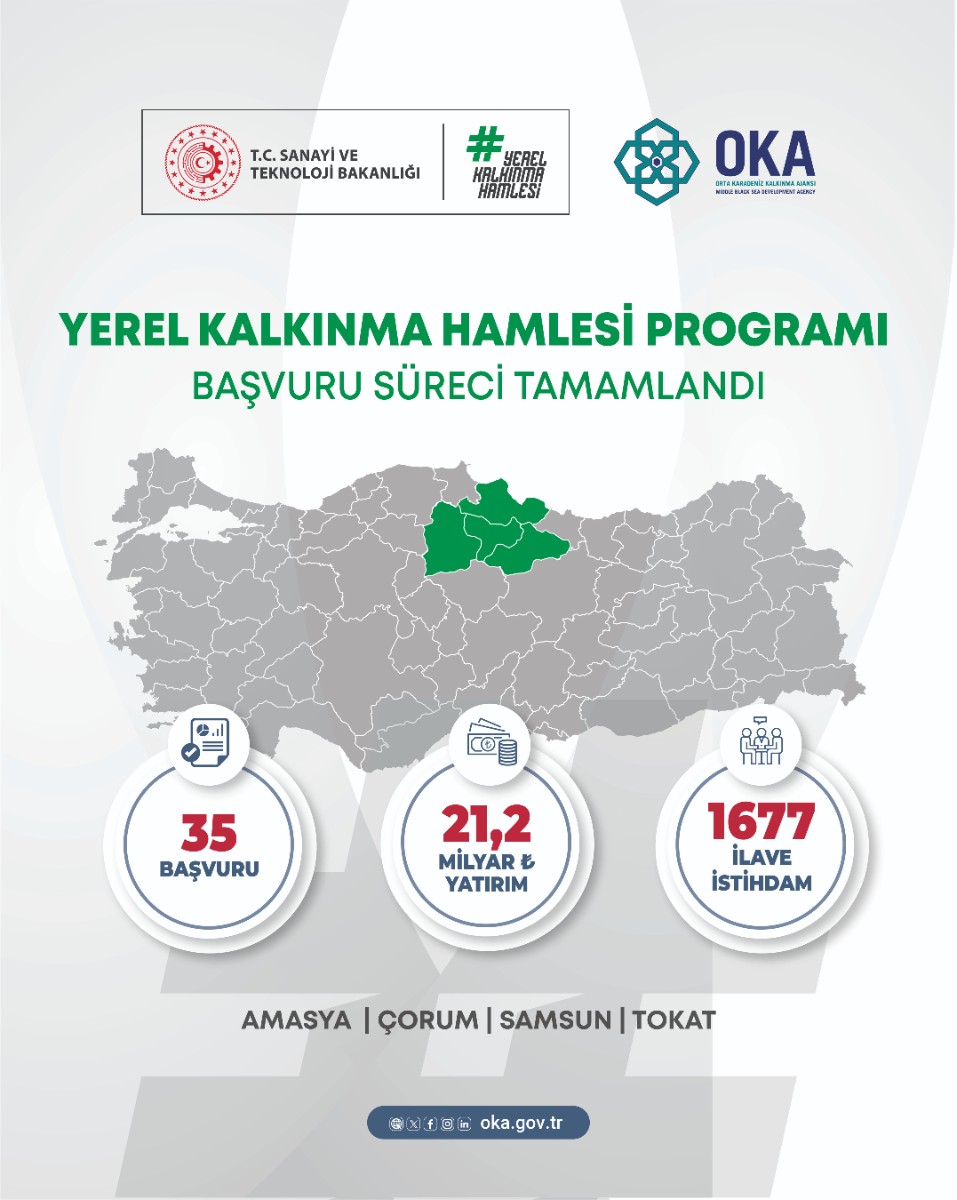 Amasya, Çorum, Samsun ve Tokat illerini kapsayan Orta Karadeniz Bölgesi’nde, Orta Karadeniz Kalkınma Ajansı (OKA) tarafından yürütülen süreçte toplam 35 yatırımcı firma programa başvuruda bulundu. Bu başvurularla birlikte; revizyon süreci sonucunda 21,2 milyar TL’lik yatırım hacmi oluştu ve 1.677 kişilik yeni istihdam hedefi ortaya kondu.